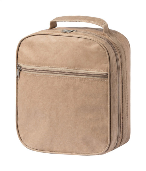 Sac isotherme zippé en papier recyclé laminé avec rembourrage en aluminium et poche frontale.