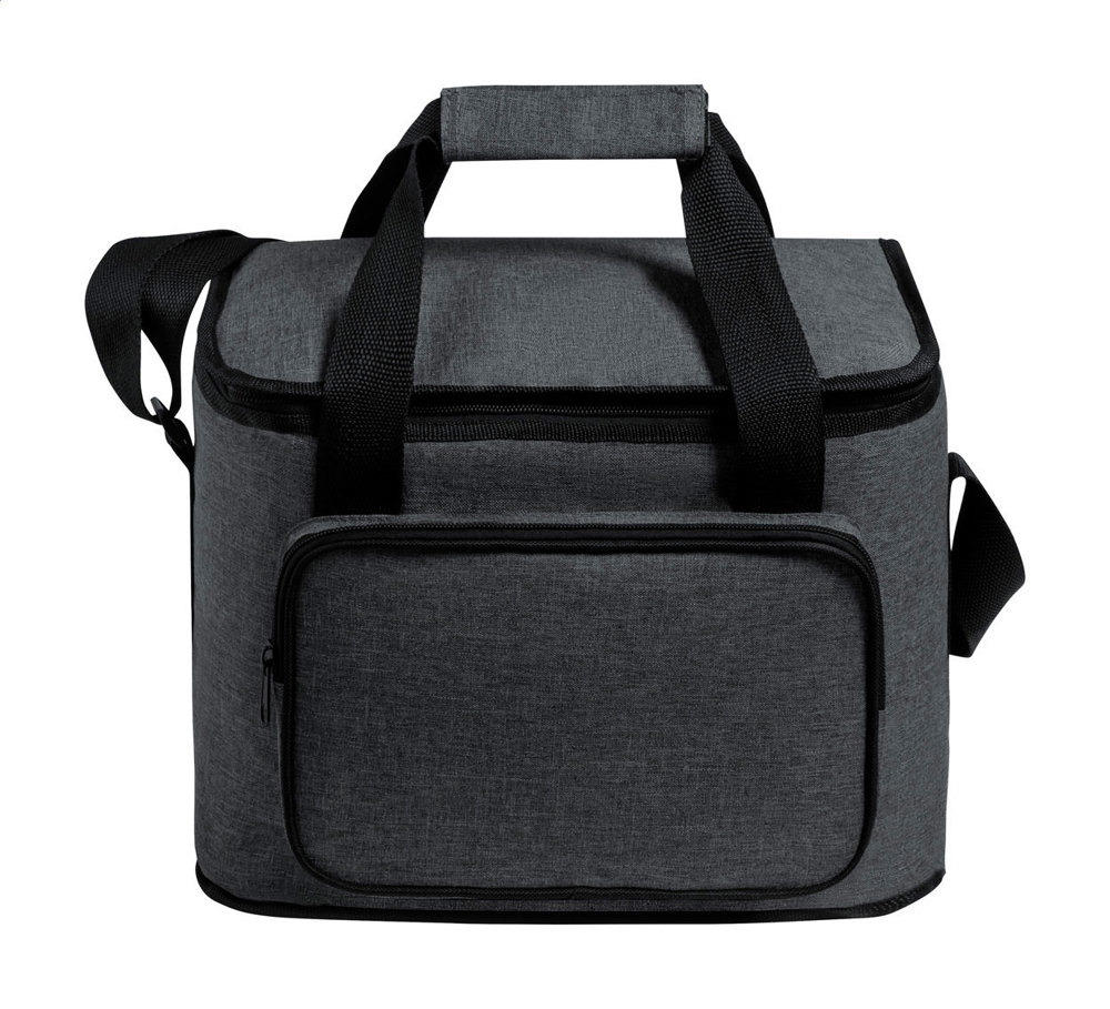 Sac isotherme RPET avec rembourrage PEVA, compartiments zippés, poignées avec velcro et bandoulière réglable. Labélisé RPET. Polyester RPET 600D.