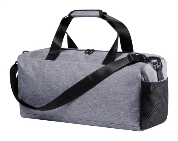 Sac de sport avec compartiment zippé, poches latérales filet et bandoulière réglable, polyester 600D.