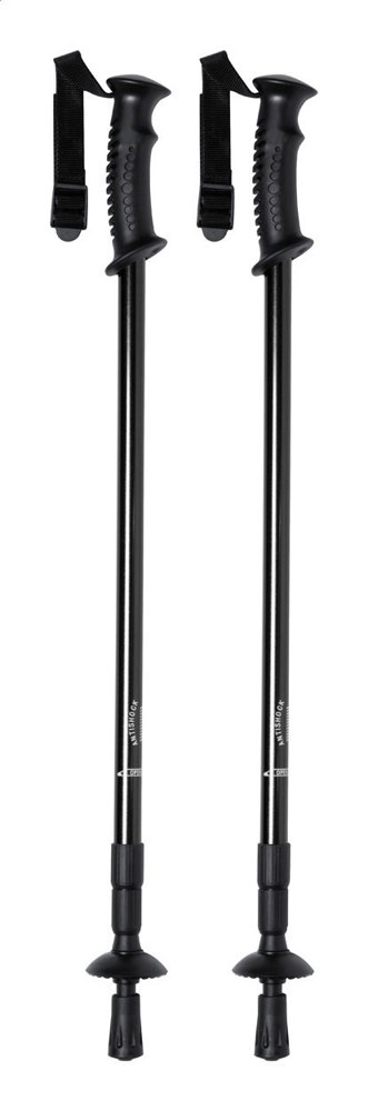 Set de 2 bâtons télescopiques marche nordique en aluminium, poignée ergonomique, dragonne, système antichoc et rondelles hiver. Livré dans un sac.