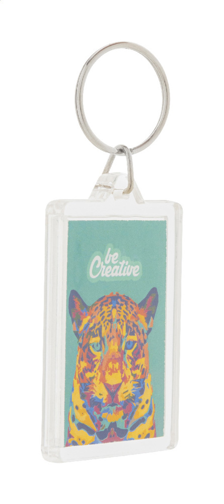 Porte-clés en acrylique de forme rectangulaire avec insertion de papier personnalisé sur base de quadri et anneau en métal. Le prix comprend l'impression numérique sur les deux faces. Quantité minimale : 100 pièces.
