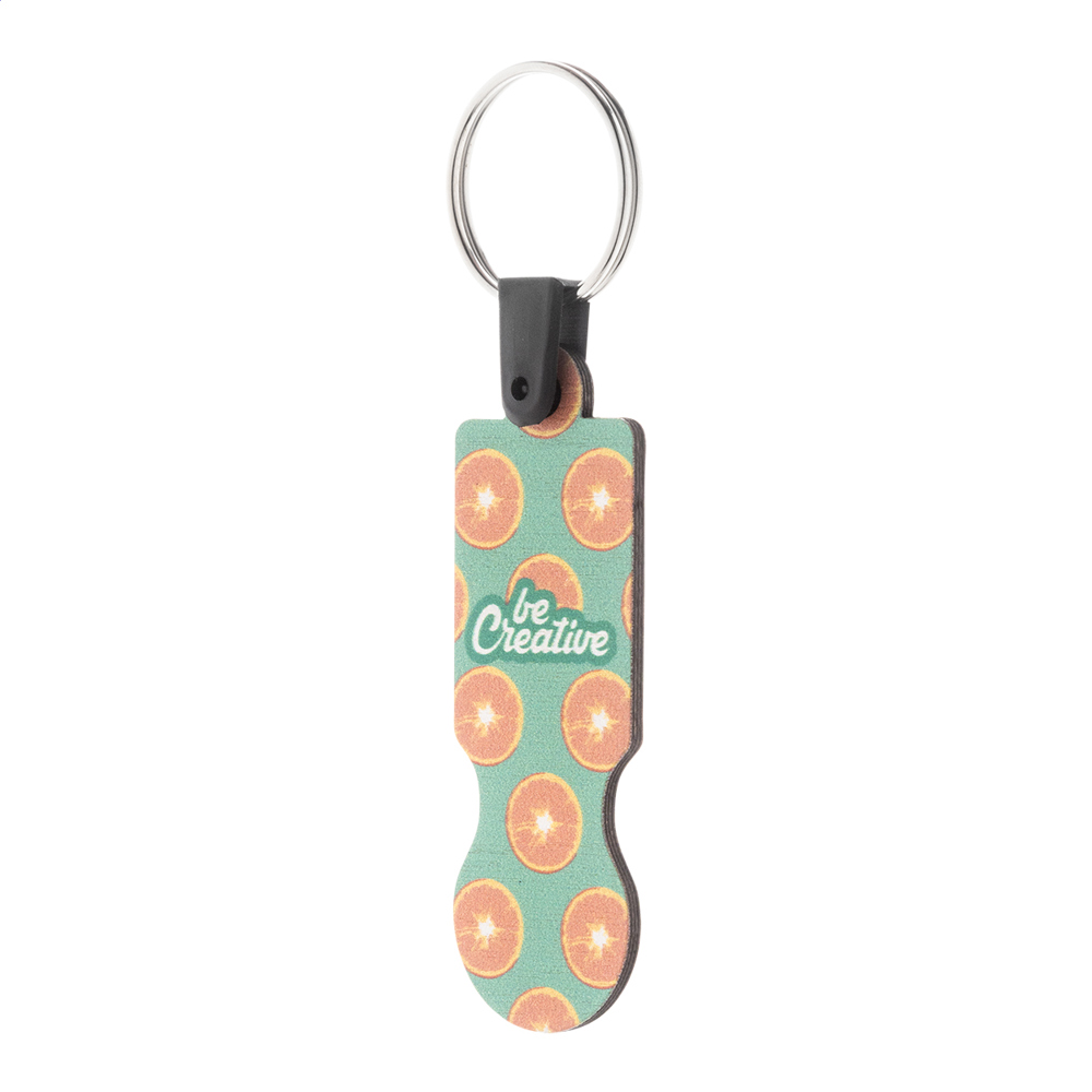 Porte-clés jeton de chariot en contreplaqué de bouleau avec impression en quadri. Le prix comprend l'impression UV LED sur une face. Quantité minimum : 200 pièces.