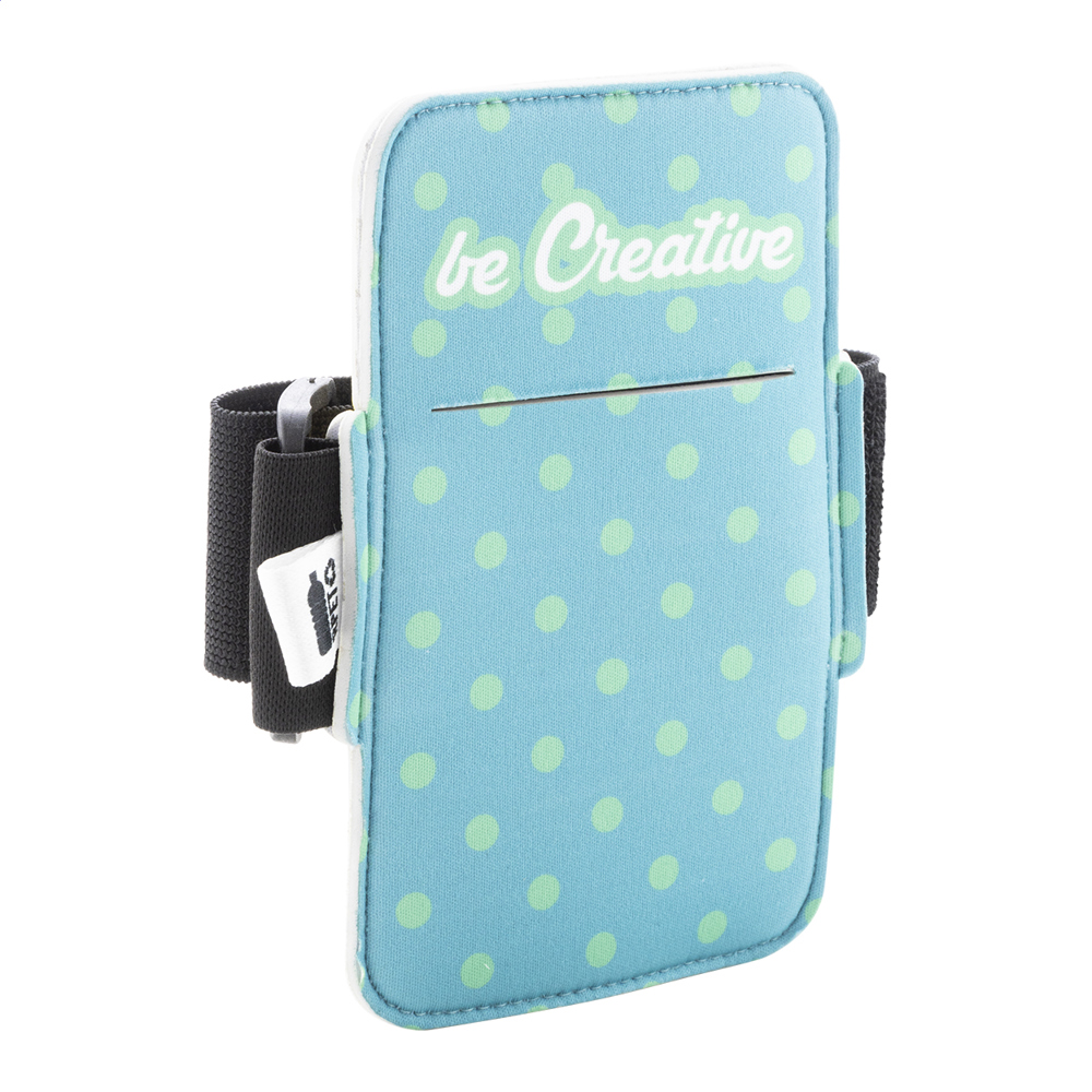 Brassard en néoprène RPET pour téléphone portable. Convient aux téléphones portables jusqu'à une taille d'écran de 6 pouces. Impression en sublimation sur toute la surface. Quantité minimale : 50 pièces.