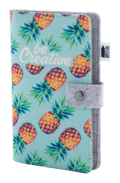 Porte-documents de voyage en feutre RPET, personnalisable avec couverture imprimée en couleur, multiples poches intérieures et fermeture à bouton-pression. Avec étiquette RPET distinctive. Le prix comprend l'impression par sublimation. Quantité minimale : 50 pièces.