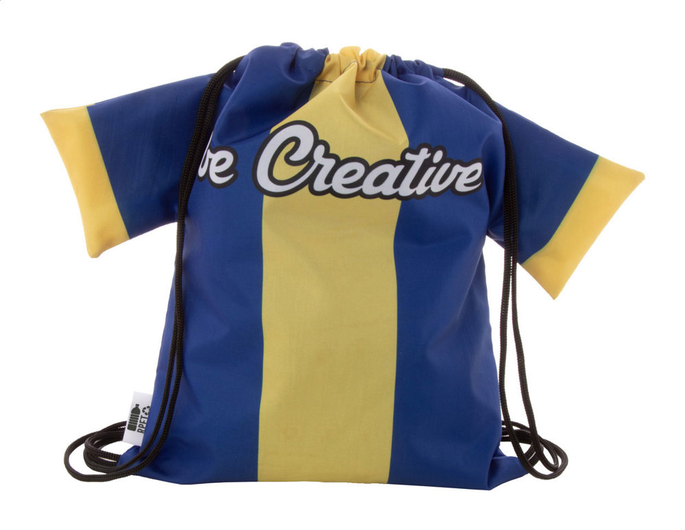 Sac enfant sur mesure en forme de T-shirt avec cordons colorés, polyester RPET 190T. Impression en sublimation sur toute la surface et labélisé RPET. Quantité minimale : 25 pièces.