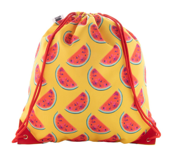 Sac piscine en RPET polyester 600D, sur mesure, avec coins renforcés en cuire PU assortis à la couleur des cordons. Imprimé en sublimation sur toute la surface et label distinctif RPET. Quantité minimale de commande : 25 pièces.