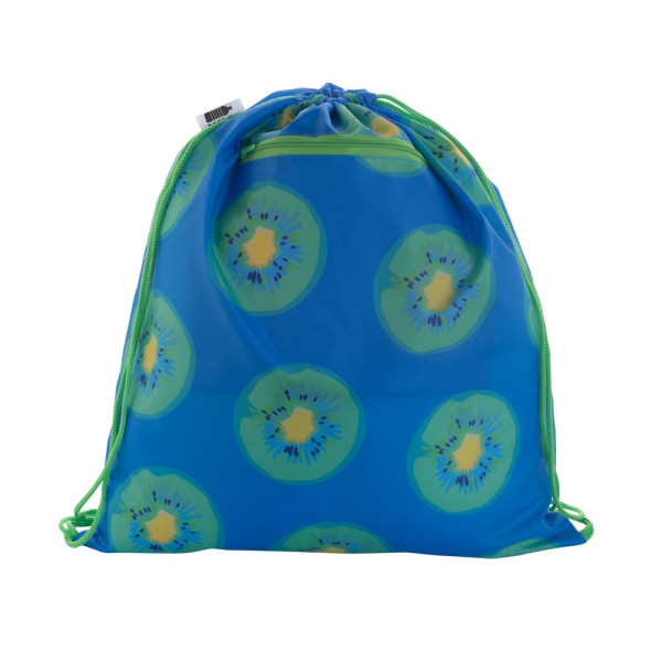 Sac piscine sur mesure avec poche frontale zippée et protégée par RFID, polyester 190T RPET. Impression en sublimation et labélisé RPET. Quantité minimale : 25 pièces.