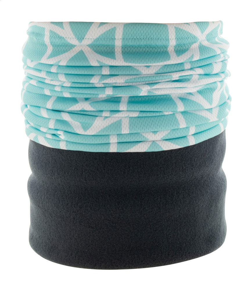 Echarpe multi-usages sur mesure en polyester respirant et à séchage rapide, avec cache-cou en polaire de couleur. Impression en sublimation totale sur la partie en polyester. Fabriquée en tissu 100 % polyester (135 g/m²) et polaire (160 g/m²). Quantité minimale : 100 pièces.