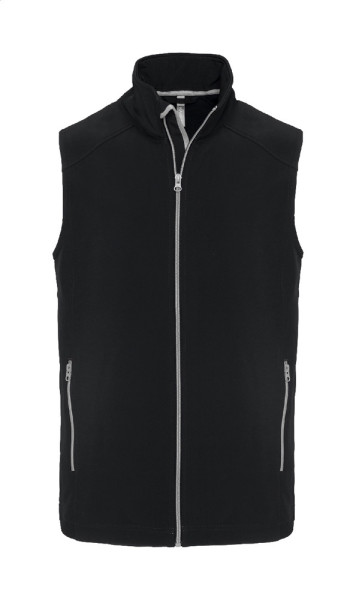 Bodywarmer soft Shell doublé, zippé, avec poches latérales zippées. Fermetures éclair contrastées. Tissu déperlant. Extérieur : 95% polyester et 5% élasthanne. Intérieur : 100% polyester micro polaire. 300 g/m². Produit de la marque Kariban.
