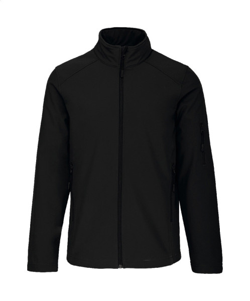 Veste soft Shell triple couche, respirante, coupe-vent et imperméable, avec manches et poches latérales zippées. Avec couche intermédiaire respirante et couche intérieure en micro polaire. 95% polyester et 5% élasthanne, 300 g/m². Produit de la marque Kariban.