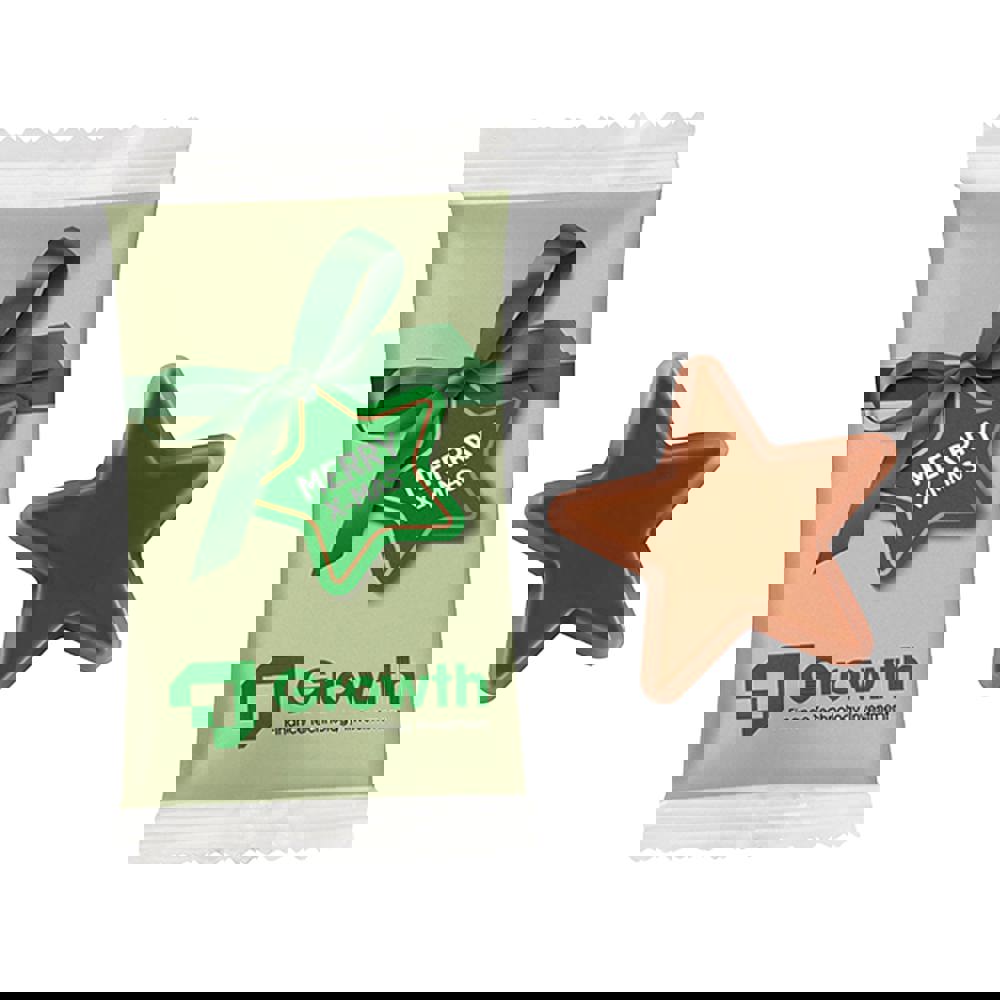 Transparante flowpack met full colour bedrukking, gevuld met 1 chocolade ster van ca. 7 gram.
