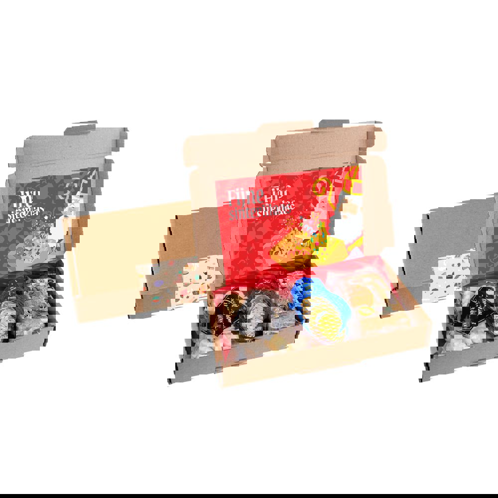 Bruin verzenddoosje A6 gevuld met een zakje Schuimpjes, een Oat King Spekulatius reep en...plus
