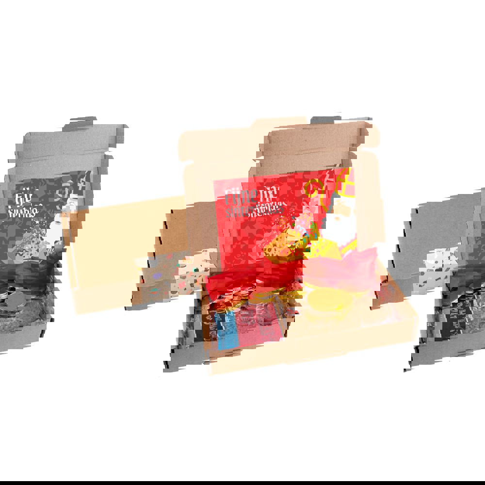 Bruin verzenddoosje A6 gevuld met een Speculaas pop en ca. 50 gram Chocolade munten. Voorzien van een dubbelzijdig bedrukte A6 kaart en gesloten d.m.v. een standaard Sinterklaassticker