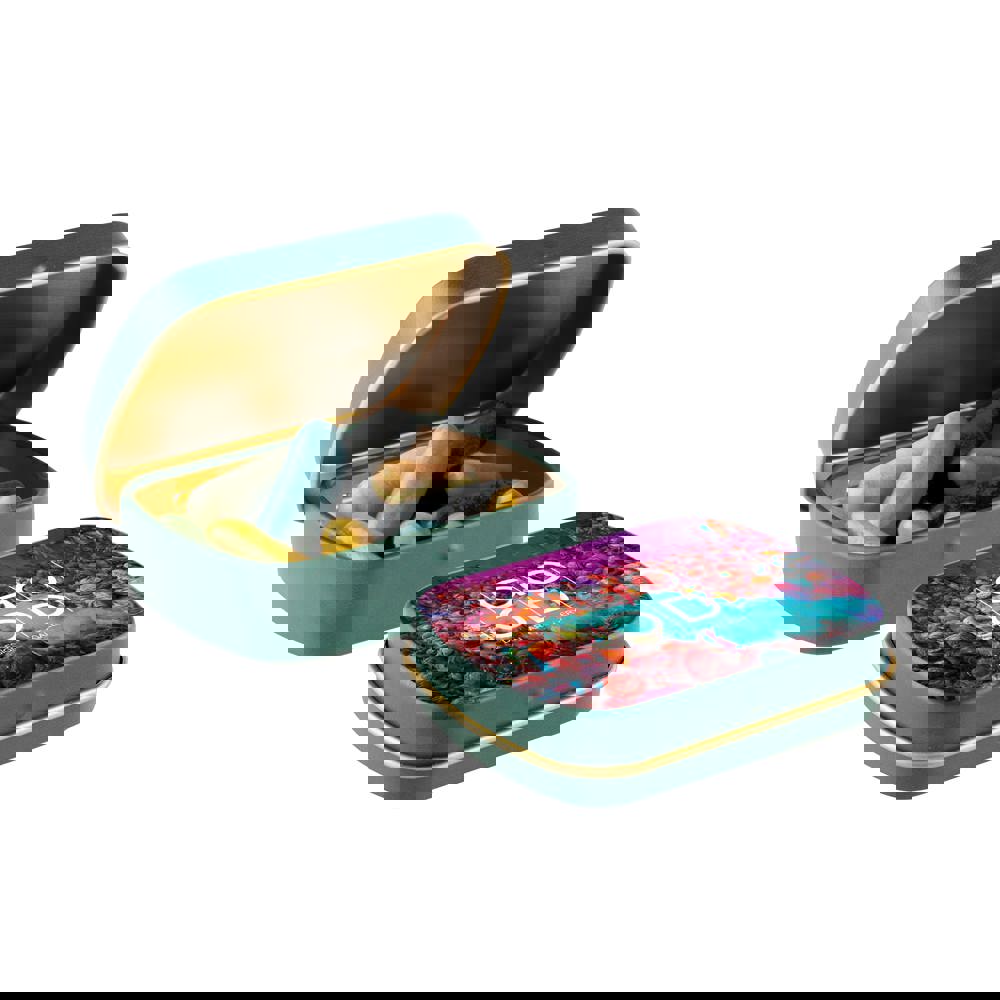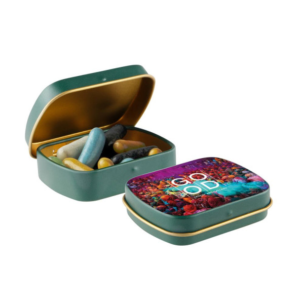 Mini scharnierblikje mat groen met gouden binnenkant en ca. 23 gram Dropstaafjes mix. Voorzien van een full colour bedrukking en inclusief ingrediëntensticker en seal.
