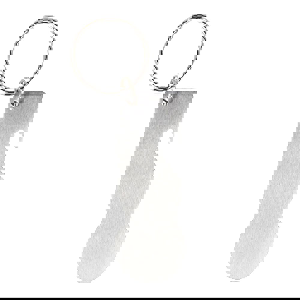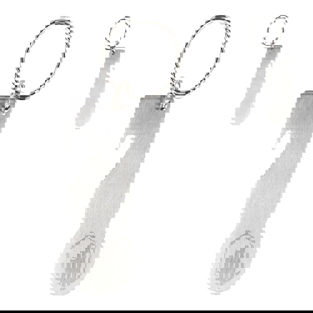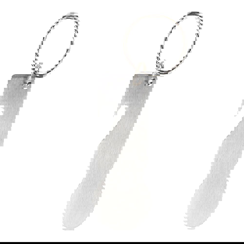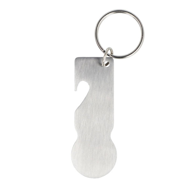 Porte-clés en acier inoxydable avec décapsuleur intégré et monnayeur de trolley compatible avec la plupart des trolleys d'Europe occidentale. Tête de pièce de 23 mm. Design pratique avec un bon espace de marquage.