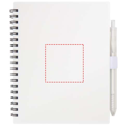 Le carnet à couverture souple Niove est fabriqué en plastique recyclé avec 70 feuilles pointillées de papier 70 g/m². Le carnet est pourvu de coins carrés et d’une boucle pour crayon. Taille du carnet : 140 x 178 mm. Le stylo bille est également fabriqué à partir de plastique recyclé. Couleur de l'encre : Bleue. Longueur d'écriture : 1000 mètres. Taille de la plume : 1,0 mm.