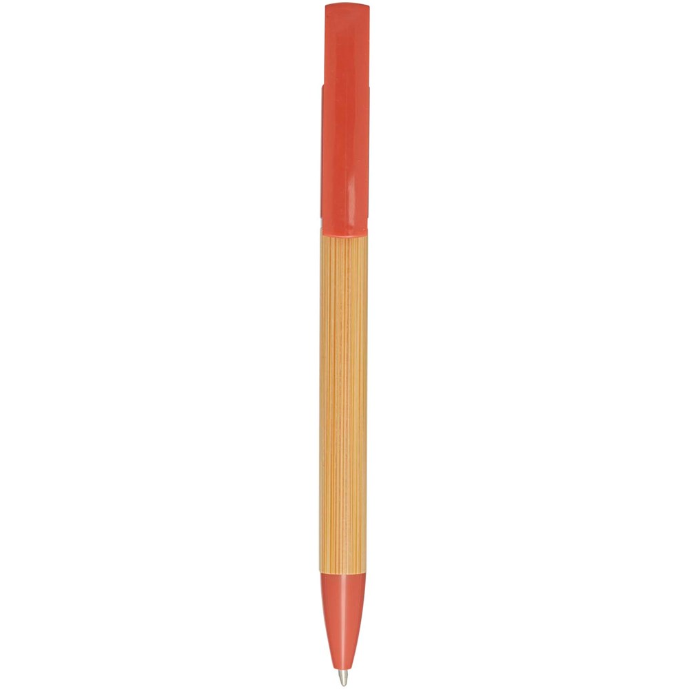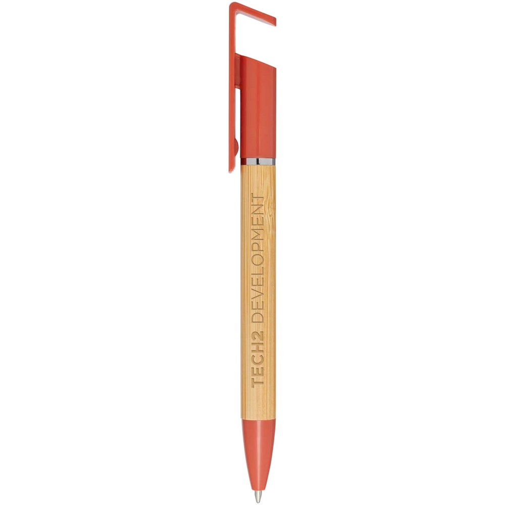 Stylo bille en bambou qui sert également de support pour téléphone. Le bouton et l'anneau central sont en plastique recyclé, la pointe est en laiton, et le corps est en bambou d'origine responsable. Couleur de l'encre : Bleue. Longueur d'écriture : 1 000 mètres. Taille de la plume : 1 mm.
