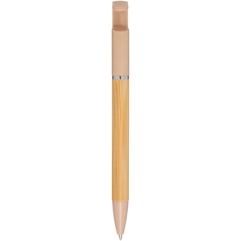 Stylo bille en bambou qui sert également de support pour téléphone. Le bouton et l'anneau central sont en plastique recyclé, la pointe est en laiton, et le corps est en bambou d'origine responsable. Couleur de l'encre : Noire. Longueur d'écriture : 1 000 mètres. Taille de la plume : 1 mm.