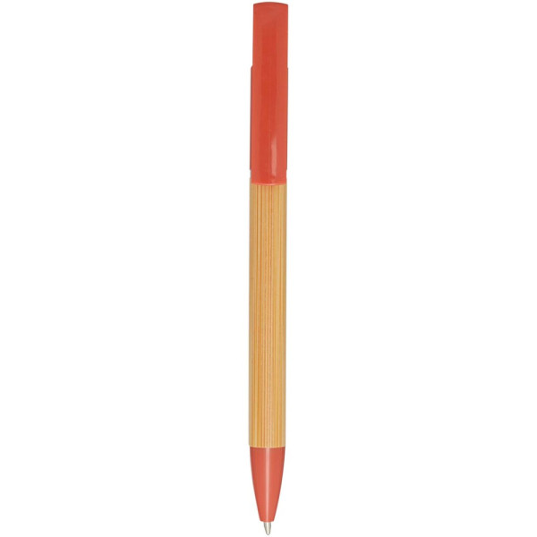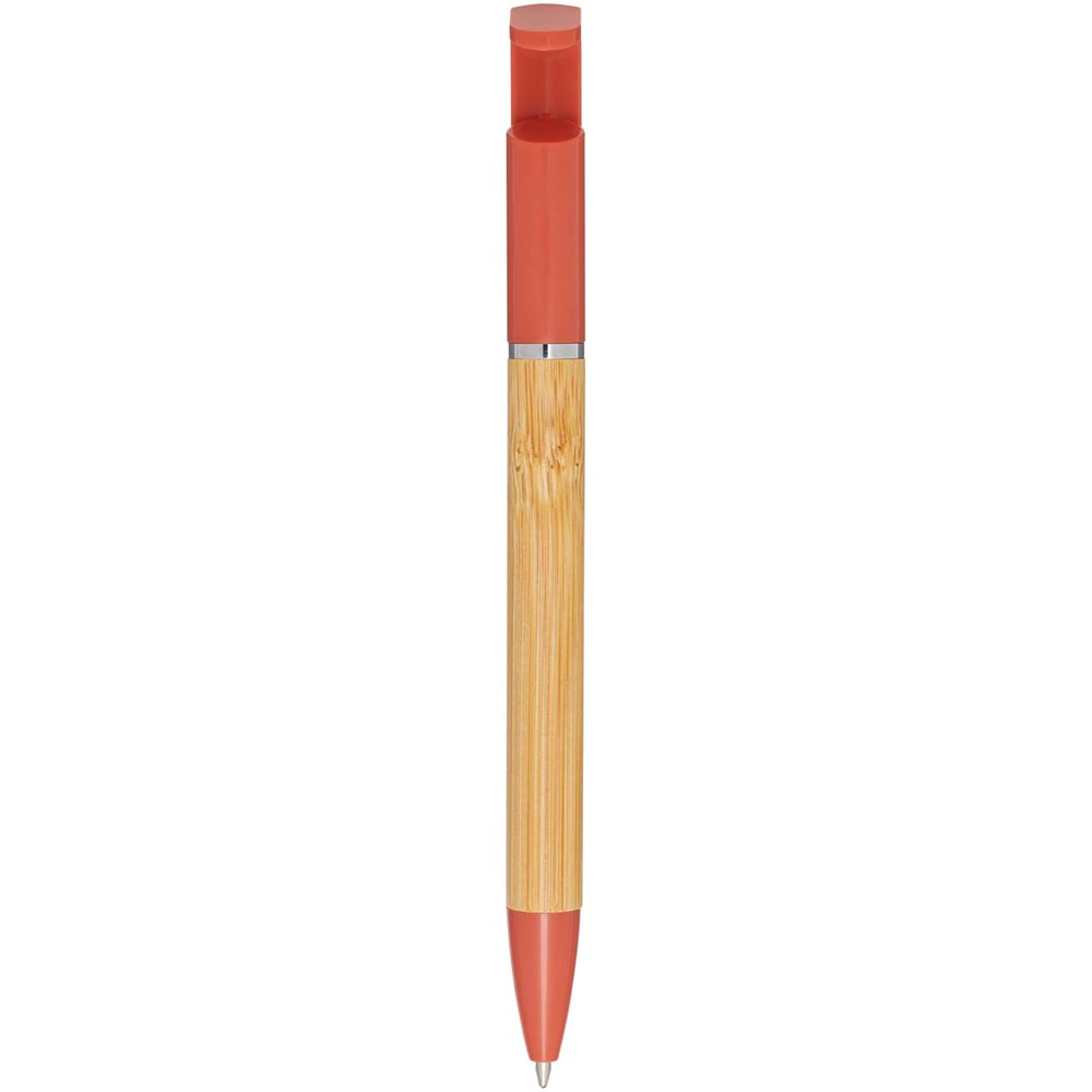 Stylo bille en bambou qui sert également de support pour téléphone. Le bouton et l'anneau central sont en plastique recyclé, la pointe est en laiton, et le corps est en bambou d'origine responsable. Couleur de l'encre : Noire. Longueur d'écriture : 1 000 mètres. Taille de la plume : 1 mm.