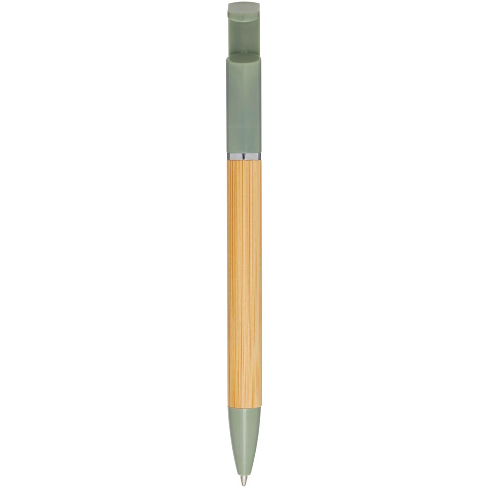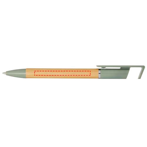 Stylo bille en bambou qui sert également de support pour téléphone. Le bouton et l'anneau central sont en plastique recyclé, la pointe est en laiton, et le corps est en bambou d'origine responsable. Couleur de l'encre : Noire. Longueur d'écriture : 1 000 mètres. Taille de la plume : 1 mm.