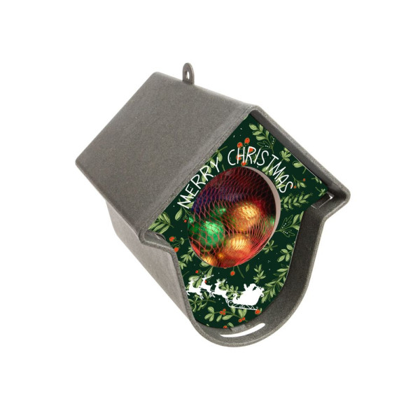 Kersthuisje Evie gemaakt van gerecycled materiaal, gevuld met 168 gram Kerstballen melkchocolade...plus