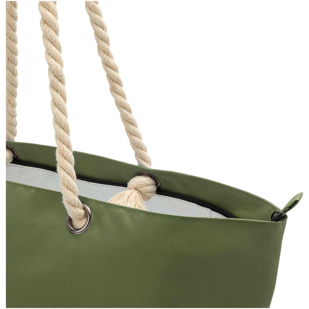 Le sac shopping isotherme Panama est fabriqué en polyester recyclé certifié GRS et comporte un grand compartiment principal zippé, ainsi que des poignées en aluminium et en corde de coton de haute qualité. Convient pour diverses activités telles que les courses ou pour une journée à la plage ou au parc. Capacité : 23 litres. Capacité de charge maximale de 10 kg. Sans PVC.