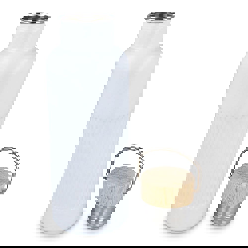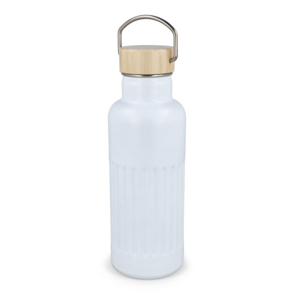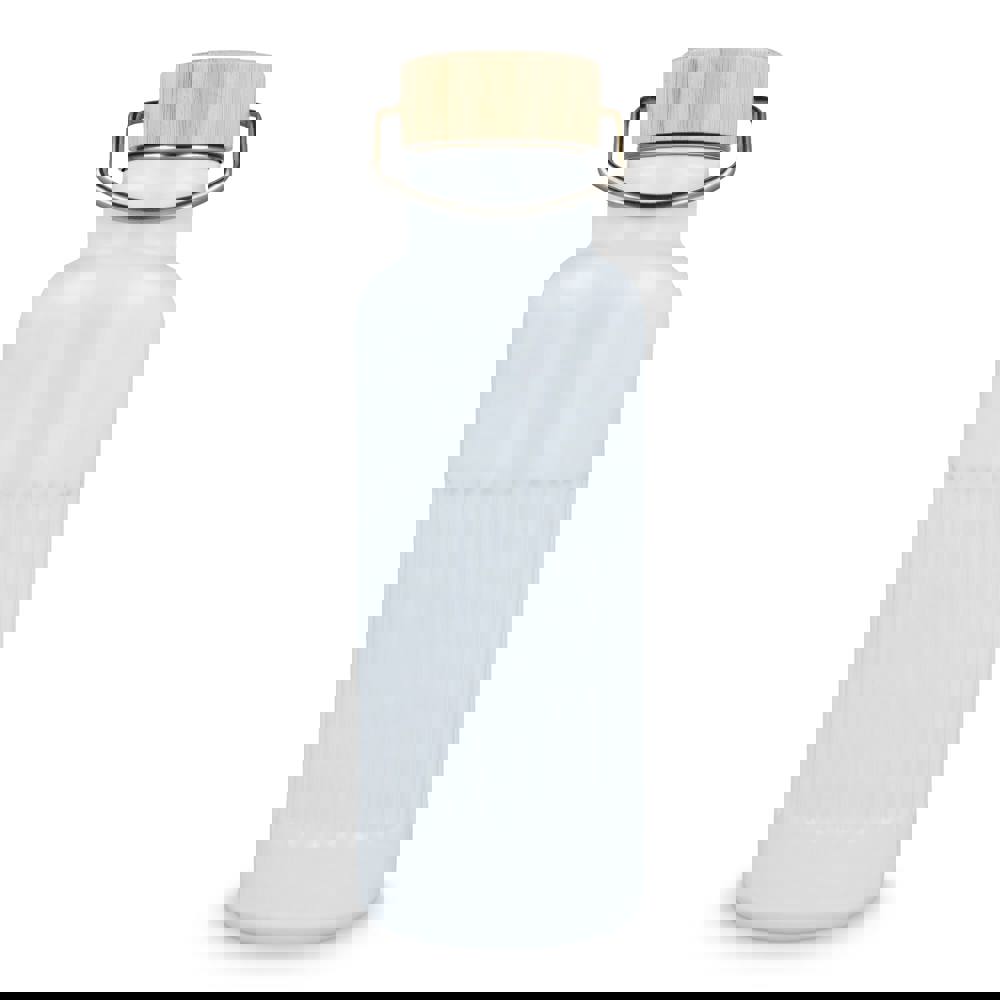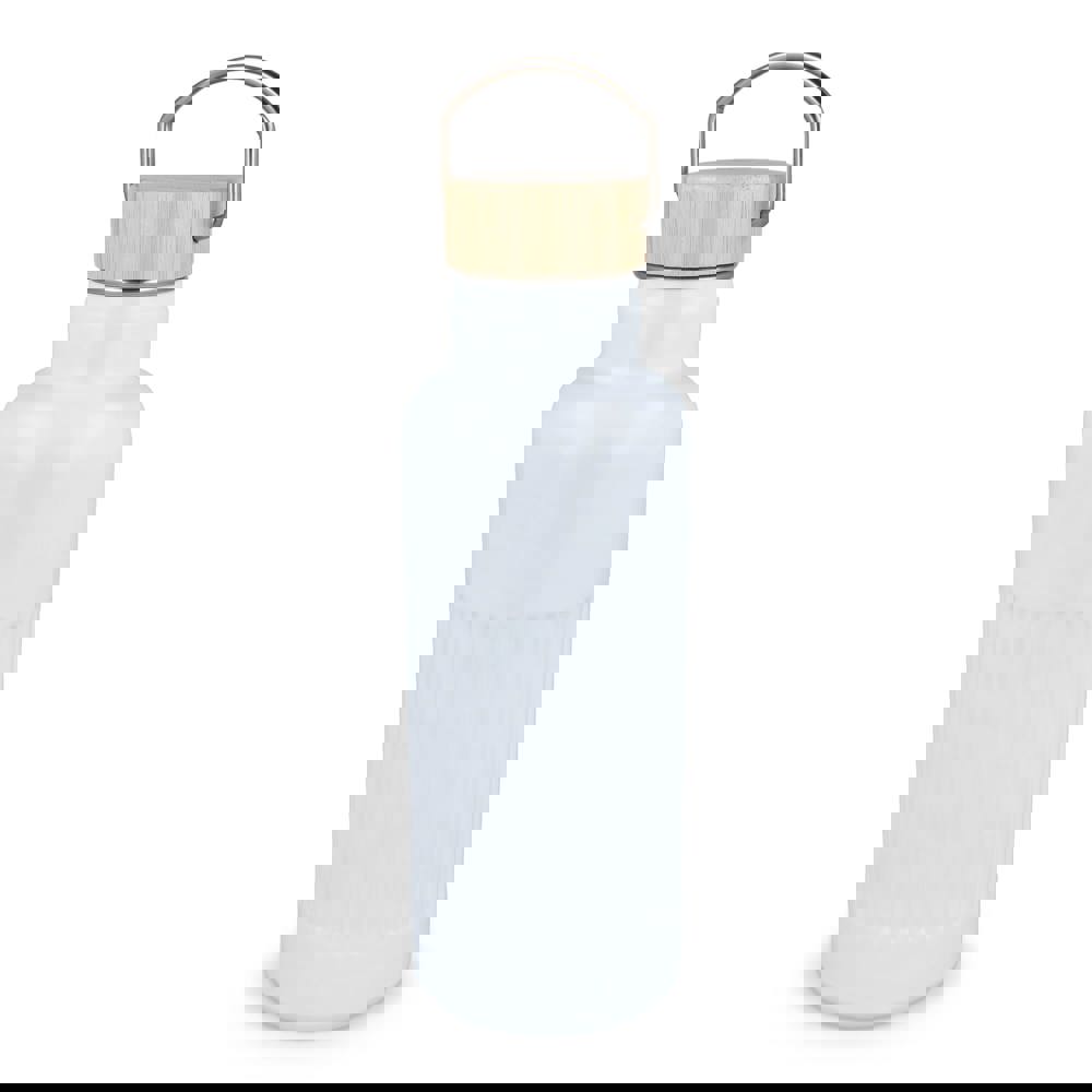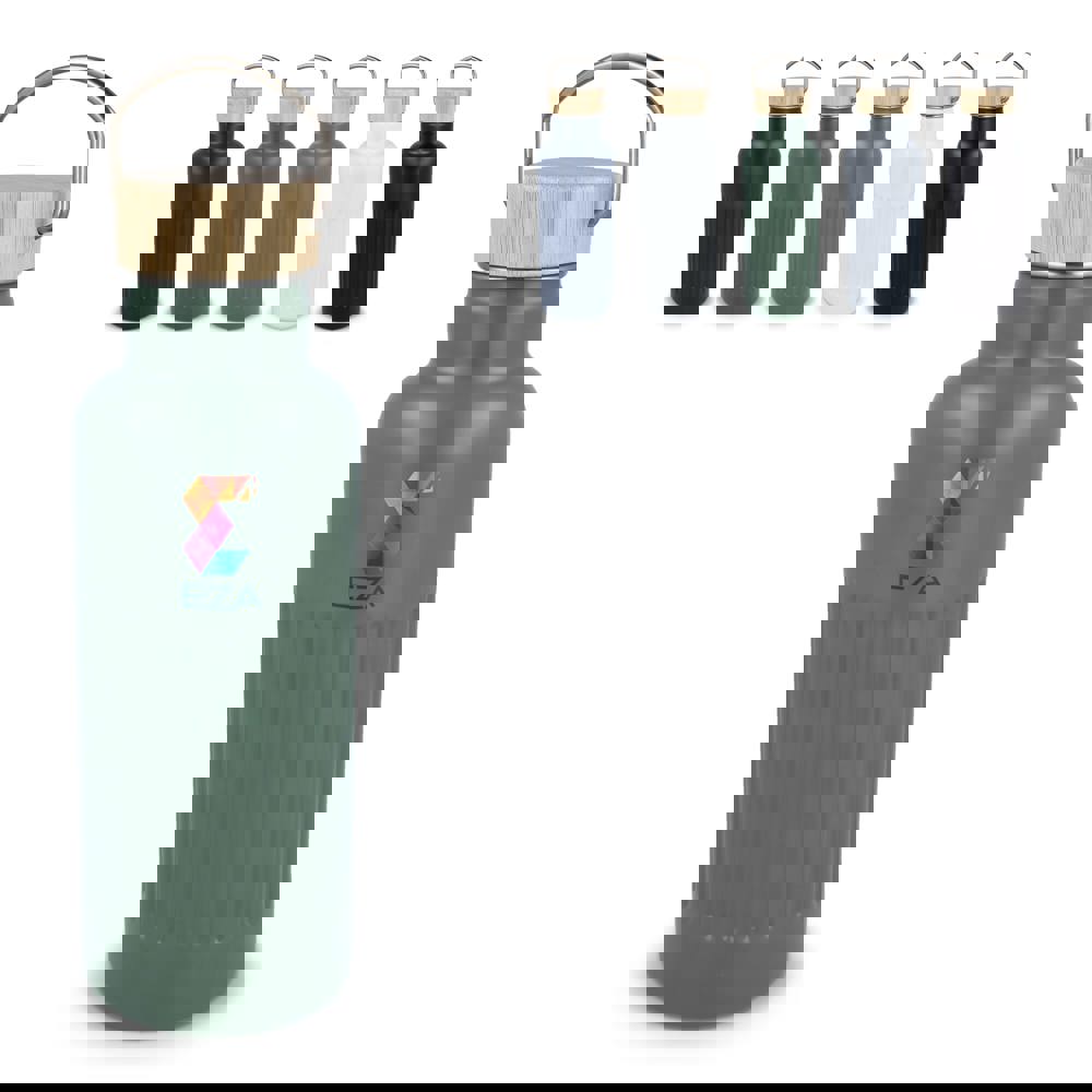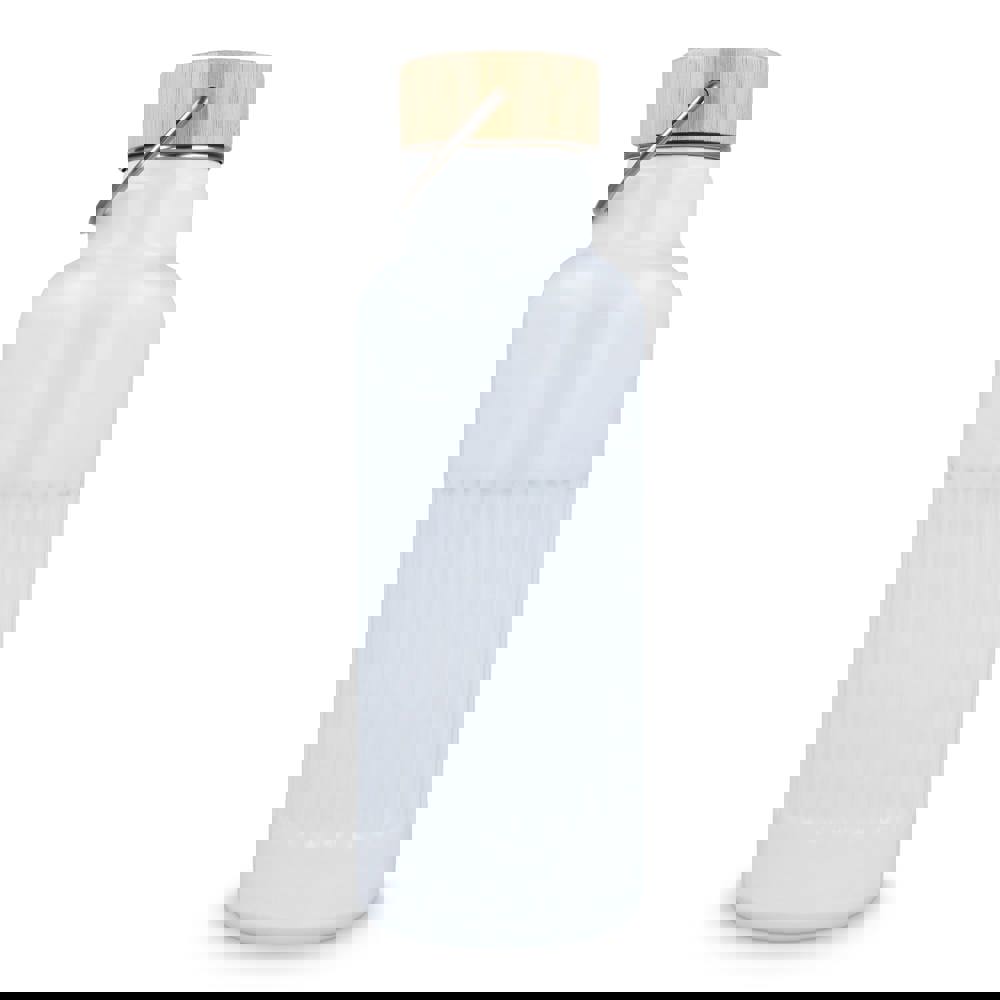 Bouteille isotherme en acier inoxydable recyclé de 500 ml avec couvercle en bambou anti-fuites. Le corps présente un motif rayé moderne. Chaque bouteille est emballée dans un coffret cadeau.