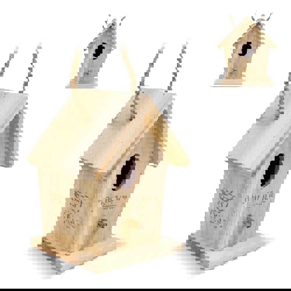 Nichoir en bois FSC avec trou d'entrée de 30 mm, adapté aux petits oiseaux de jardin tels que les mésanges bleues et les mésanges charbonnières. Favorise la biodiversité et la lutte naturelle contre les nuisibles. Un cadeau promotionnel durable pour les jardins.