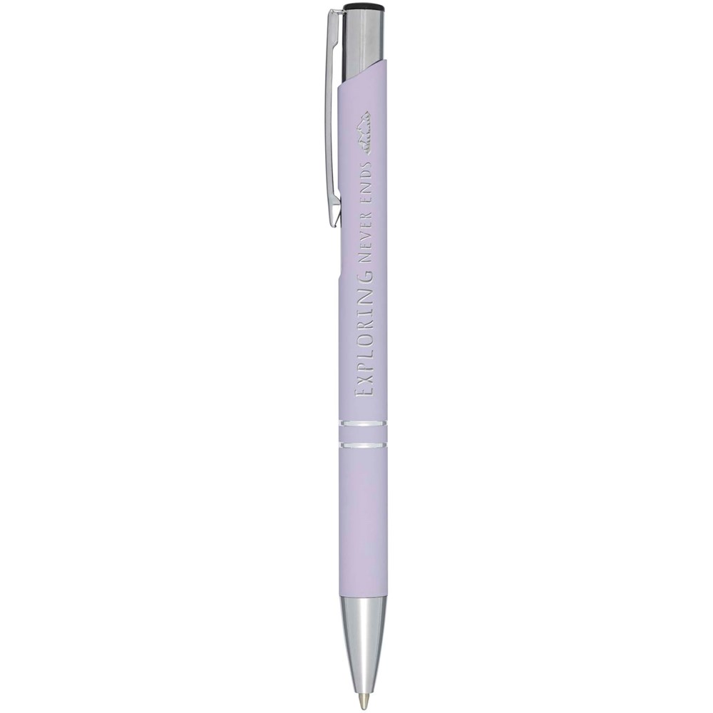 Le revêtement en caoutchouc rend le stylo doux au toucher, et une fois qu'il est gravé au laser, la sous-couche argentée apparaît. Stylo bille rétractable avec revêtement en caoutchouc noir, finitions chromées et sur-couche en ABS noir. La gamme Moneta, vaste et populaire, est disponible dans de nombreux styles et finitions différents.