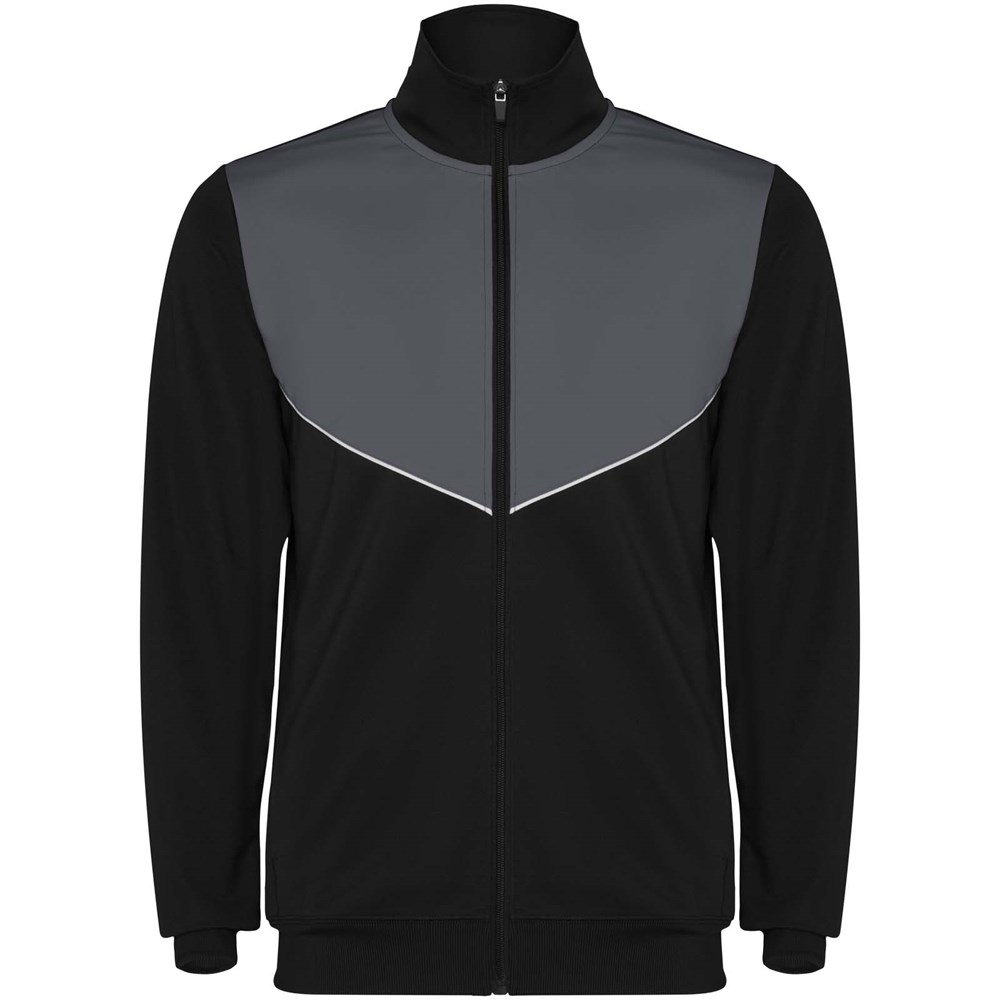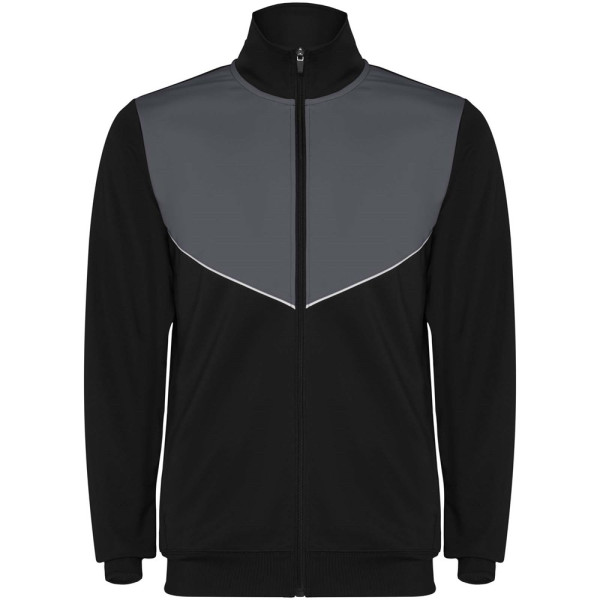 Survêtement en tissu léger et élastique. Veste avec couleur contrastée et finitions cousues sur la poitrine. Col montant avec coutures contrastées. Fermeture à glissière centrale sur le devant. Poches latérales. Poignets et taille côtelés 2x2. Pantalon avec ceinture élastique et cordon de serrage. Pièce latérale contrastée avec finition cousue. Ourlet zippé.