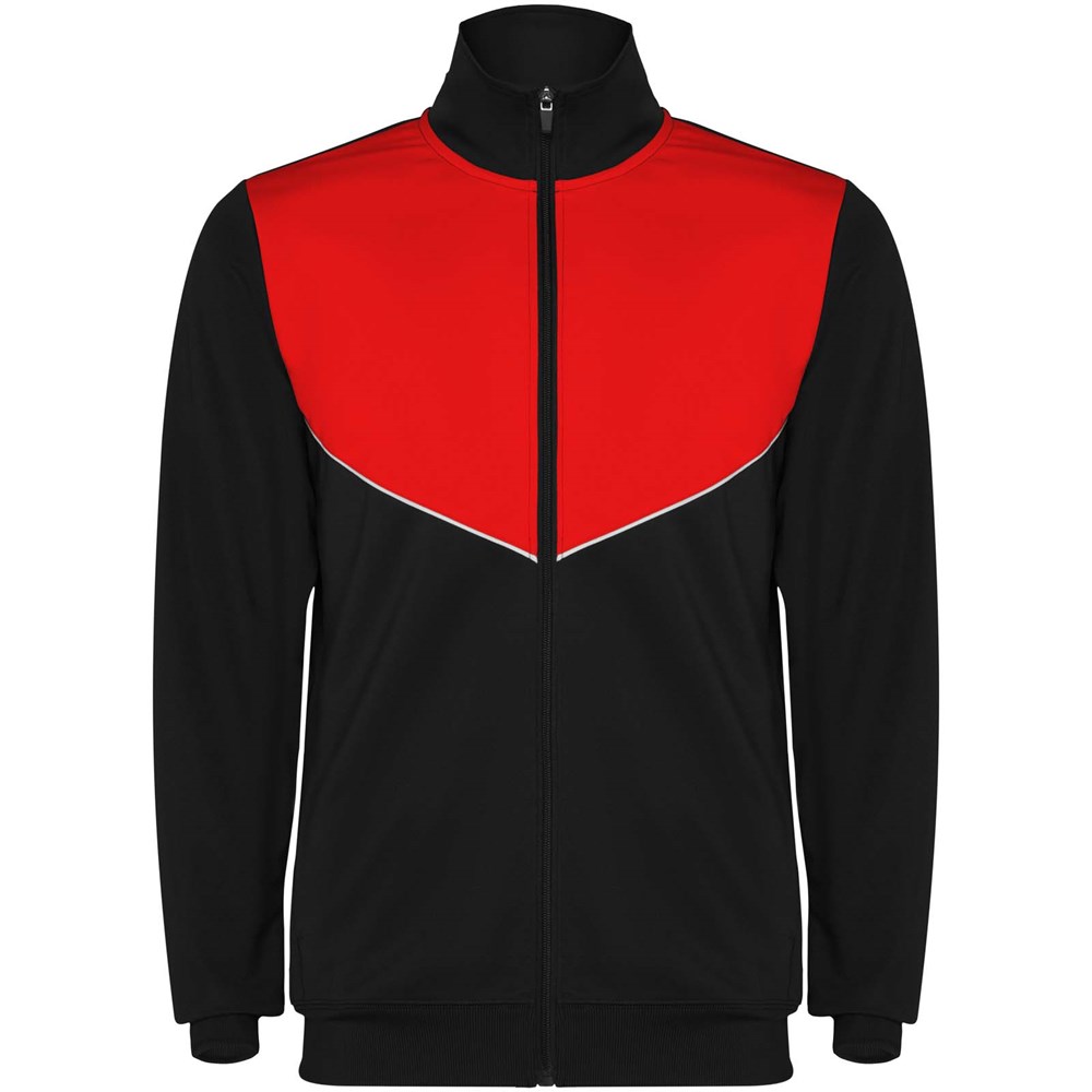 Survêtement en tissu léger et élastique. Veste avec couleur contrastée et finitions cousues sur la poitrine. Col montant avec coutures contrastées. Fermeture à glissière centrale sur le devant. Poches latérales. Poignets et taille côtelés 2x2. Pantalon avec ceinture élastique et cordon de serrage. Pièce latérale contrastée avec finition cousue. Ourlet zippé.