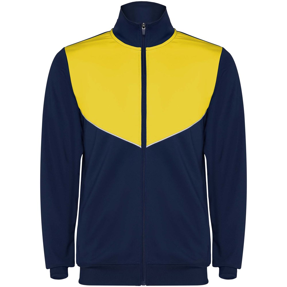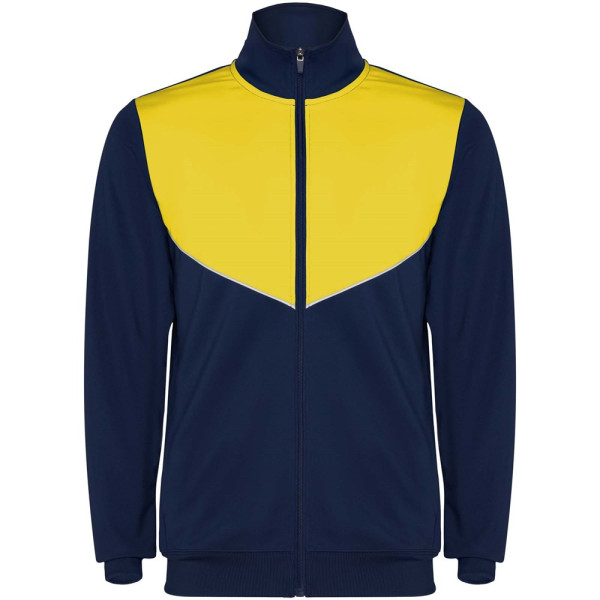 Survêtement en tissu léger et élastique. Veste avec couleur contrastée et finitions cousues sur la poitrine. Col montant avec coutures contrastées. Fermeture à glissière centrale sur le devant. Poches latérales. Poignets et taille côtelés 2x2. Pantalon avec ceinture élastique et cordon de serrage. Pièce latérale contrastée avec finition cousue. Ourlet zippé.
