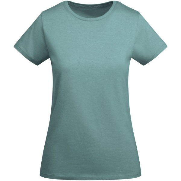 T-shirt ajusté à manches courtes pour femme en coton organique. Col rond côtelé 1x1. Coutures recouvertes renforcées au col. Coutures latérales. Étiquette détachable.