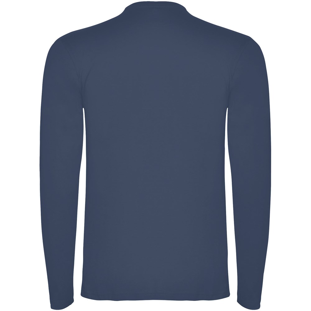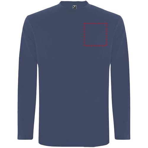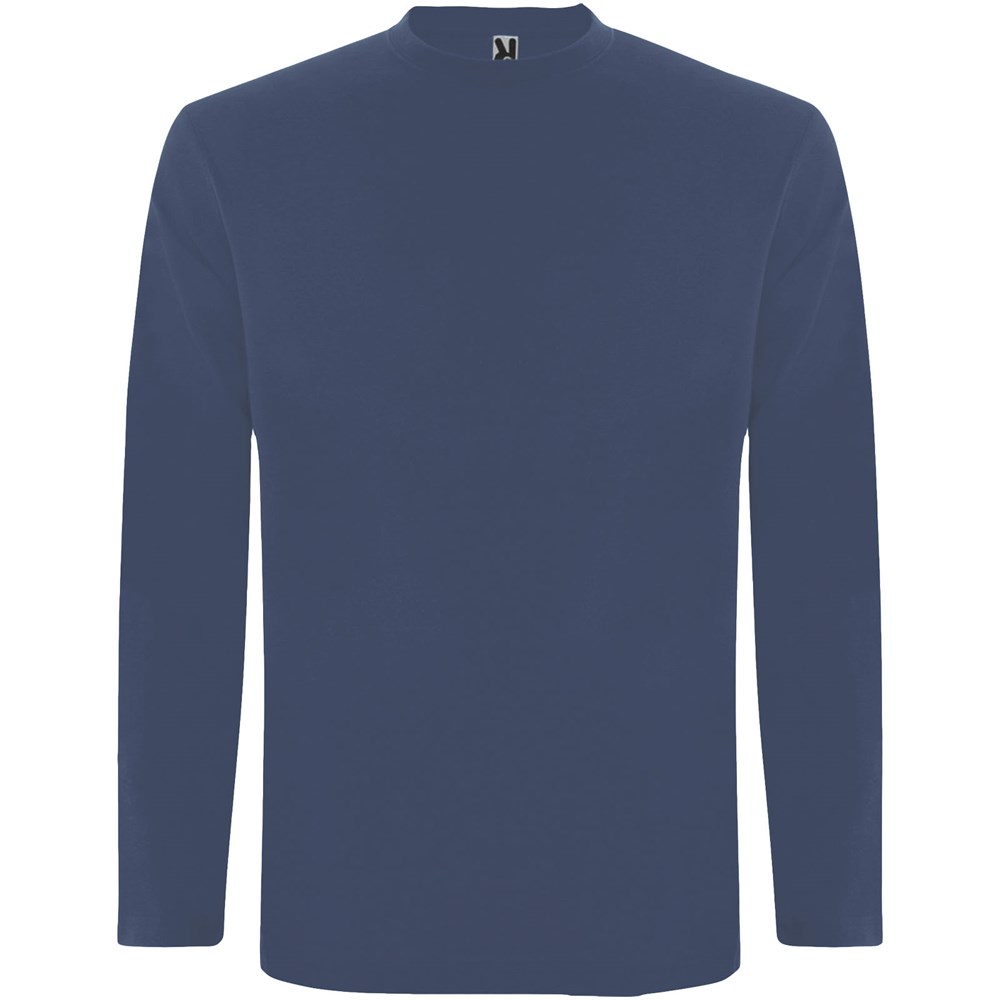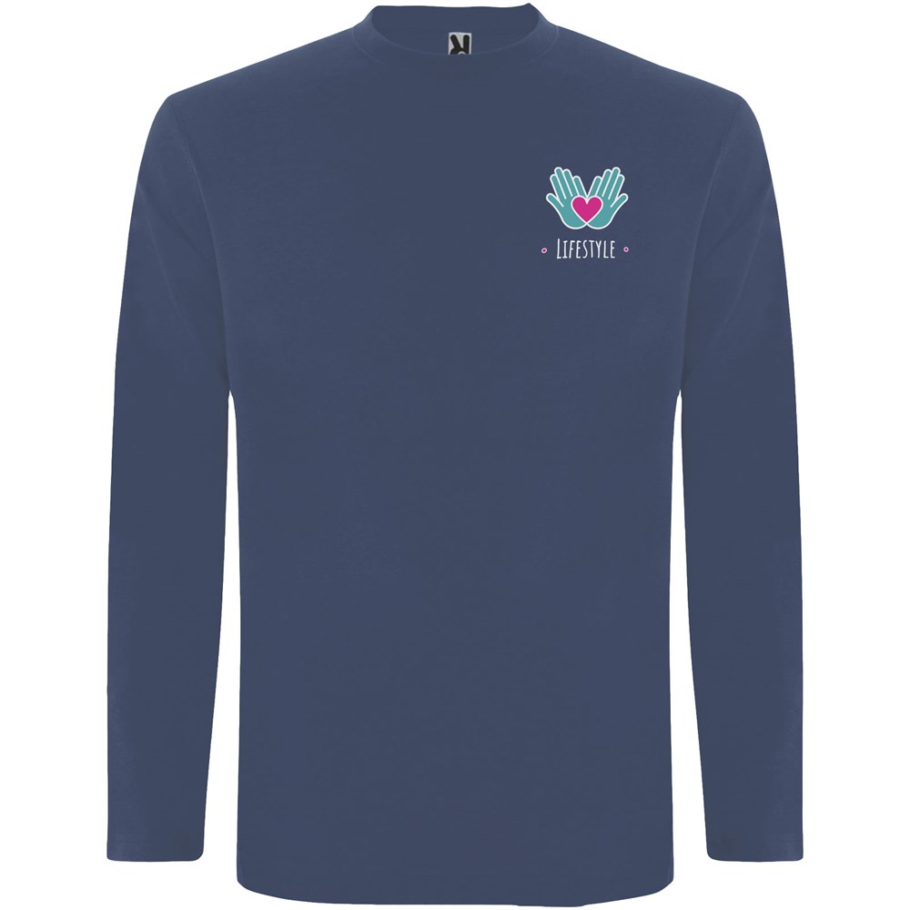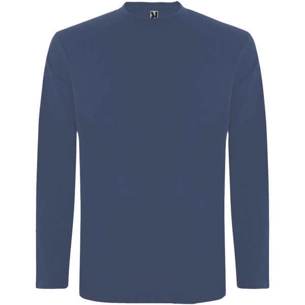 T-shirt à manches longues en tissu tubulaire et col rond 4 épaisseurs. Coutures recouvertes renforcées au col et aux épaules. Pas de manchettes. Étiquette détachable. Conception tubulaire en tailles adultes et coutures latérales en tailles enfants. Le mannequin mesure 185 cm et porte la taille L.