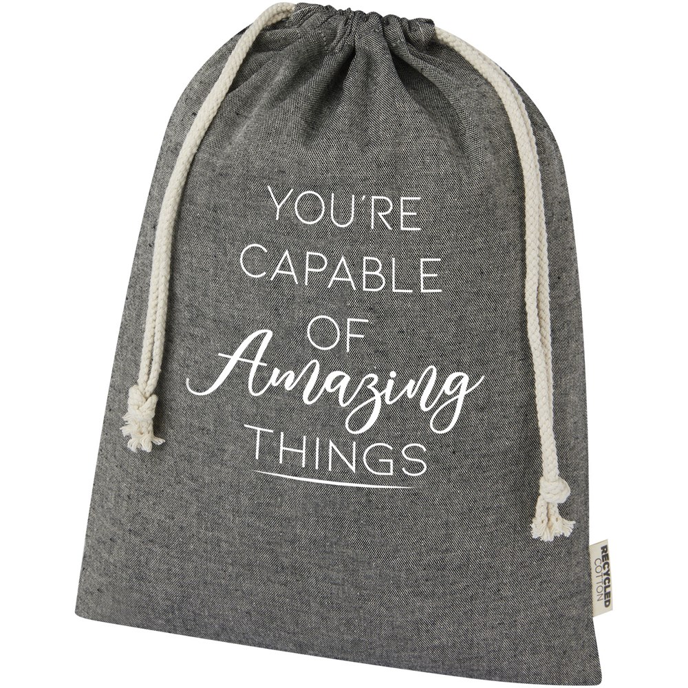 Sac cadeau en coton recyclé certifié GRS avec fermeture à cordon en coton. Idéal pour offrir ou stocker des objets. Dimensions : 30 x 42 cm. Il peut y avoir des variations mineures dans la couleur du produit en raison de la nature du processus de production.