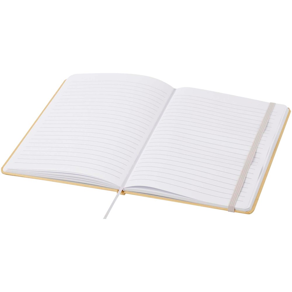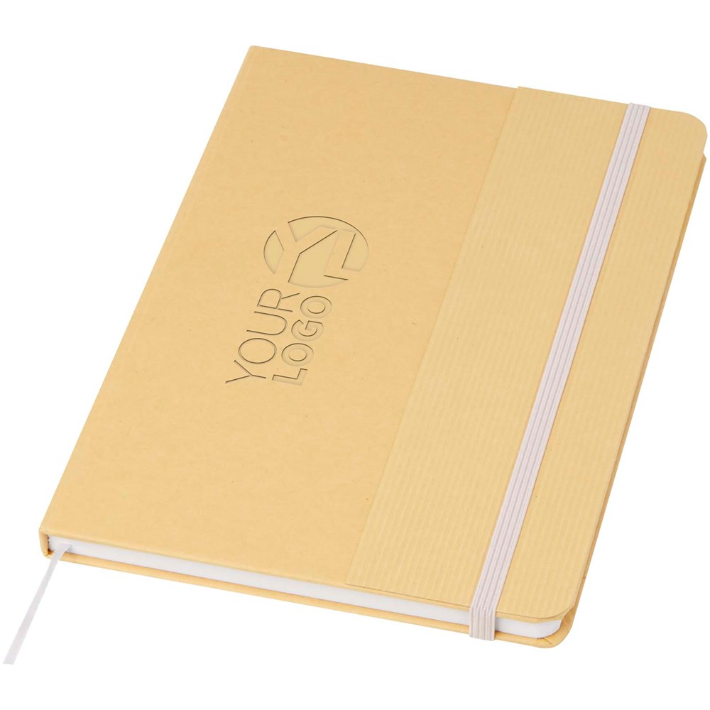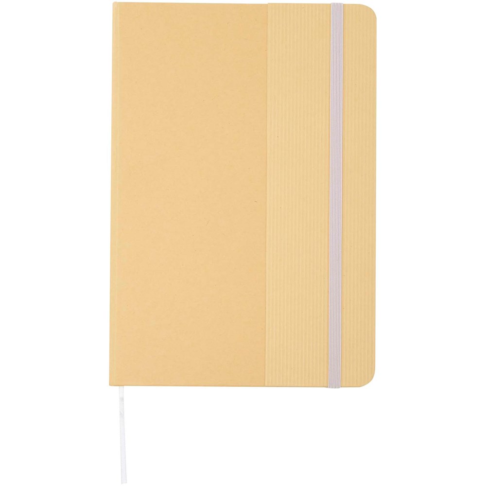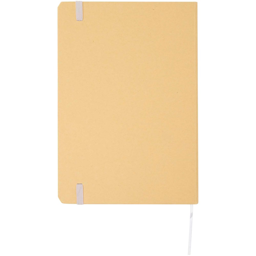 Carnet A5 à couverture rigide en carton recyclé avec 80 feuilles lignées en papier 70 g/m². Le carnet est doté d'une fermeture élastique, d'un ruban et de coins arrondis.