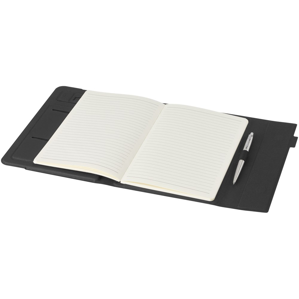 Le porte-documents Liberto certifié RCS est partiellement fabriqué à partir de polyester recyclé post-consommation, ce qui en fait un choix plus durable puisqu'il contribue à réduire l'utilisation de matières premières vierges. Il comprend une boucle pour stylo, une pochette accordéon et 64 feuilles lignées de couleur crème avec du papier recyclé de 80 g/m2 provenant de sources durables. Le stylo et les autres accessoires figurant sur les photos ne sont pas inclus dans cet article.