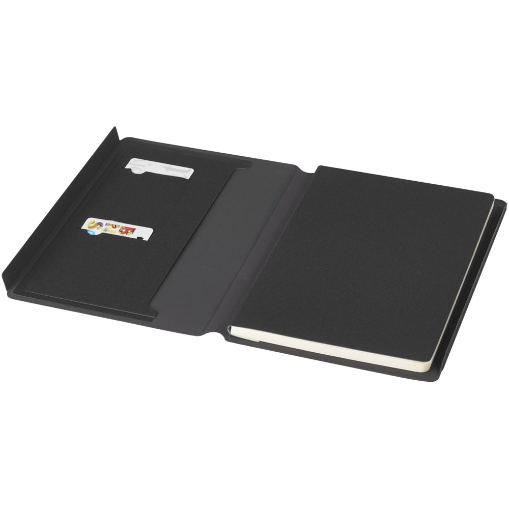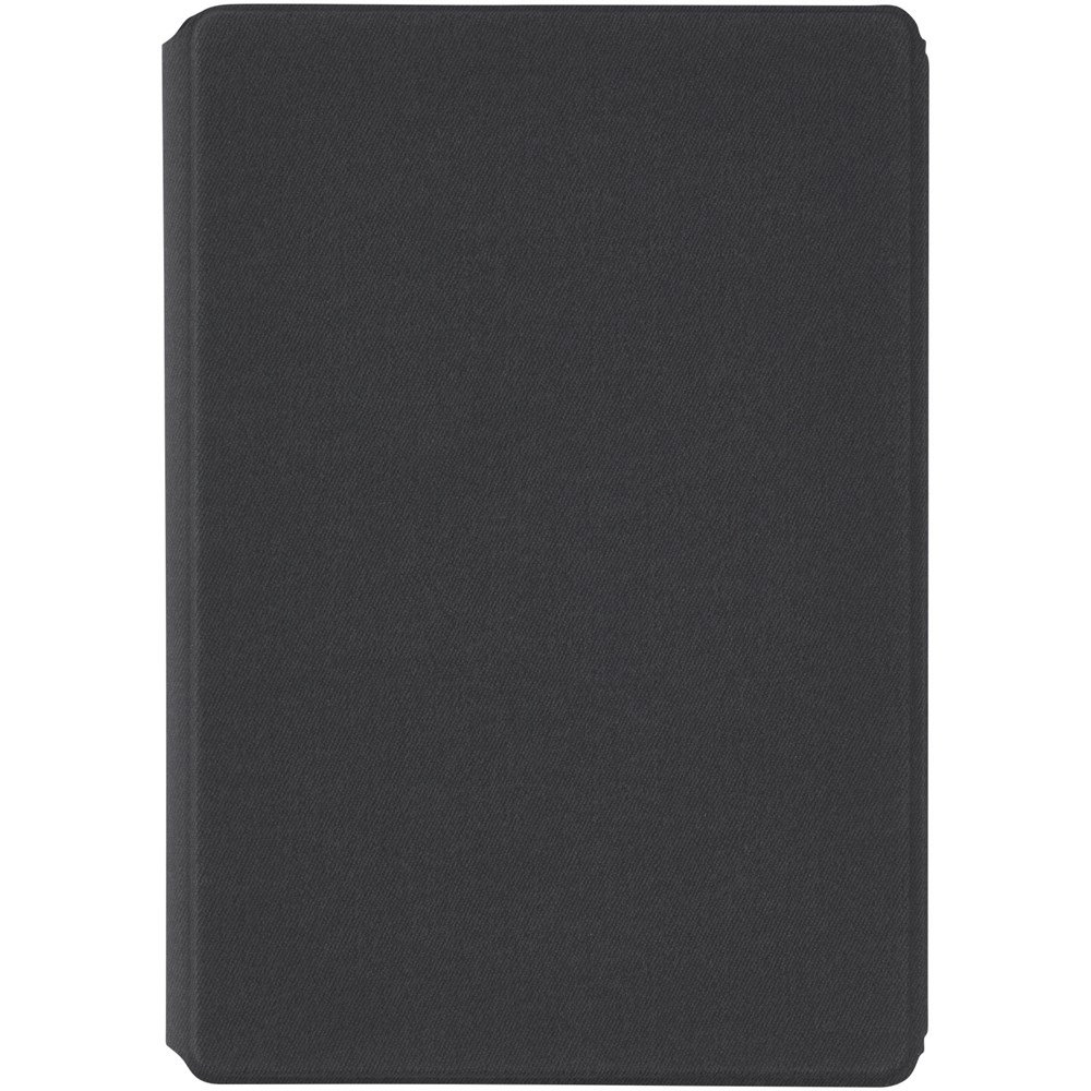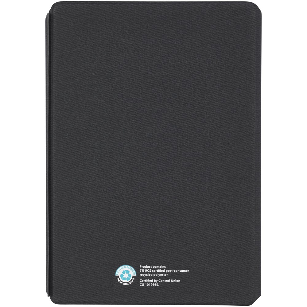 Le porte-documents Notu certifié RCS est partiellement fabriqué à partir de polyester recyclé post-consommation, ce qui en fait un choix plus durable, puisqu'il contribue à réduire l'utilisation de matières premières vierges. Il est doté d'une fermeture aimantée, d'une pochette accordéon et de 64 feuilles lignées de couleur crème avec du papier recyclé de 80 g/m2 provenant de sources durables.