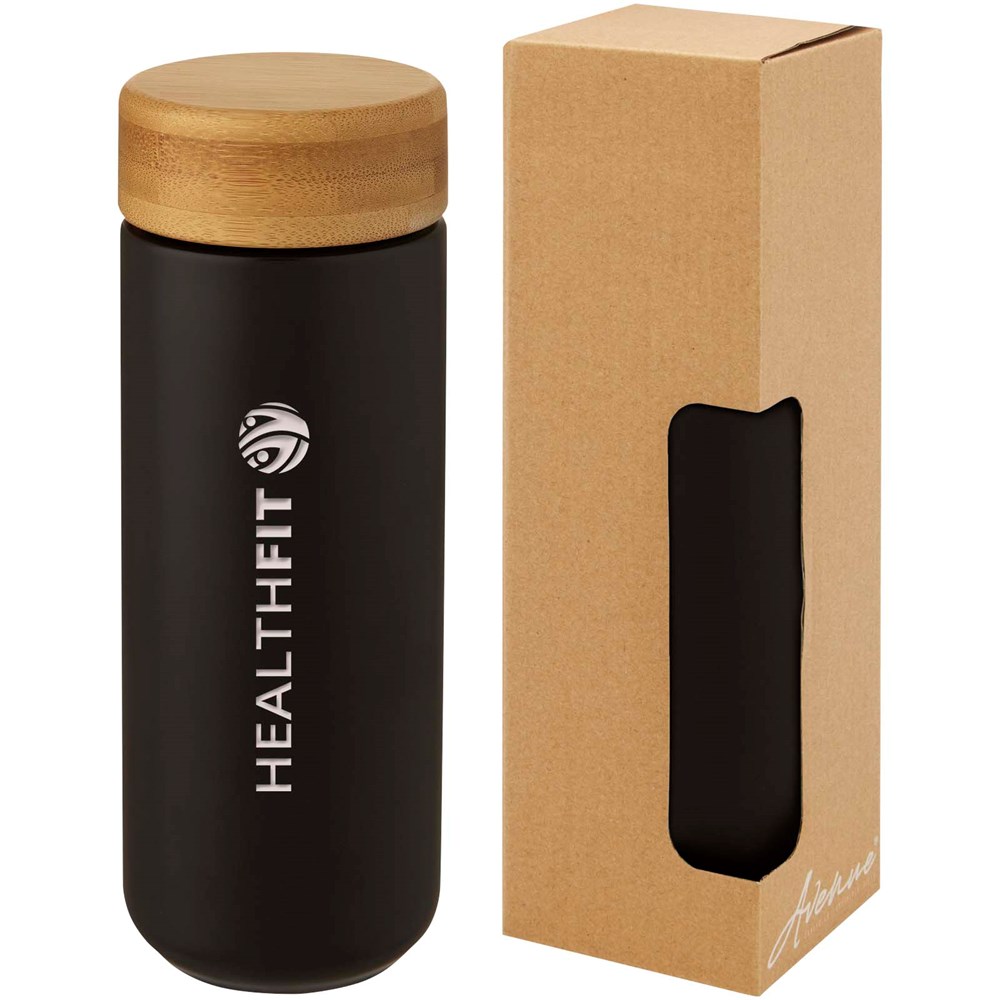 Gobelet en céramique avec couvercle en bambou élégant. La construction en céramique à double paroi permet d'éviter la condensation sur l'extérieur du gobelet. Le couvercle vissé, résistant aux déversements, est fabriqué à partir de bambou durable, écologique et socialement responsable. Sans bisphénol A, testé et approuvé par la législation allemande sur la sécurité alimentaire (LFGB). Testée et approuvée pour la teneur en phtalates conformément à la réglementation REACH. Capacité de 300 ml. Lavage à la main recommandé. Livrée dans un coffret cadeau en carton recyclé.