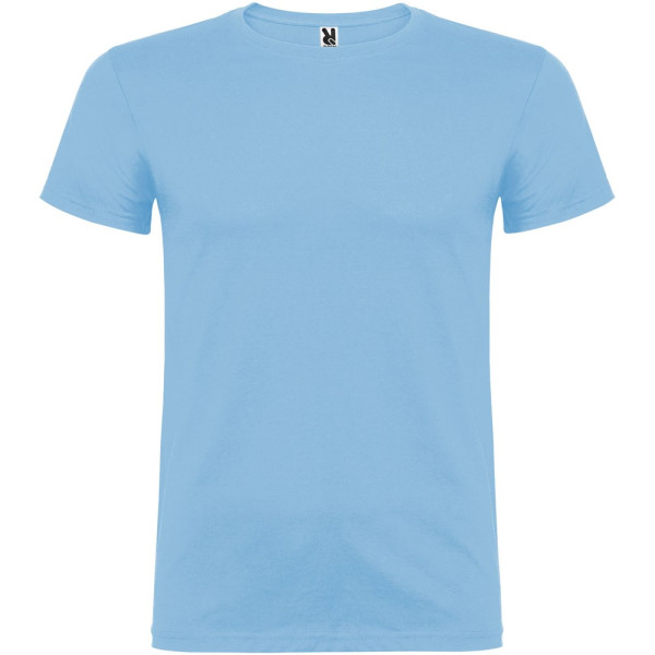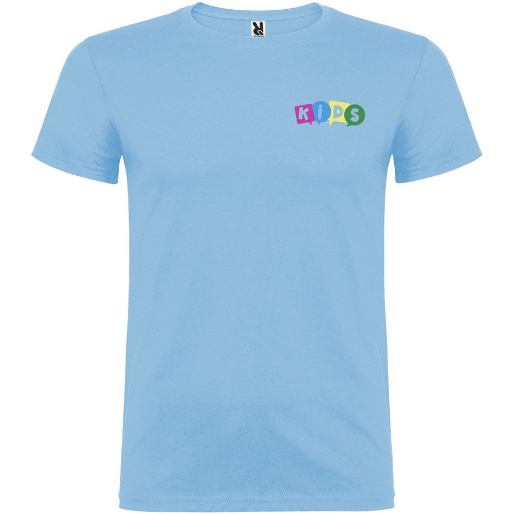 T-shirt à manches courtes avec col rond double épaisseur en élasthanne en tissu avec coutures latérales. Coutures recouvertes renforcées au col. Étiquette détachable. Le mannequin mesure 120 cm et porte la taille 5/6.