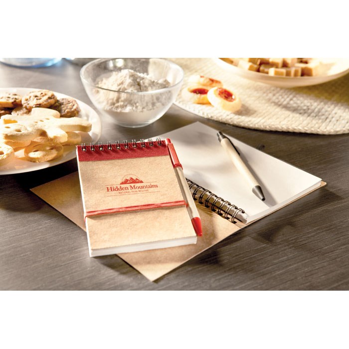 Carnet à spirale en papier recyclé avec stylo assorti. 140 pages en papier recyclé ordinaire (70 feuilles). Stylo à bille à bouton poussoir assorti en carton recyclé et plastique biodégradable. Encre bleue. Bande élastique de fermeture et passant à stylo. FSC®-certified | FSC MIX, P7.1, FSC-C213206