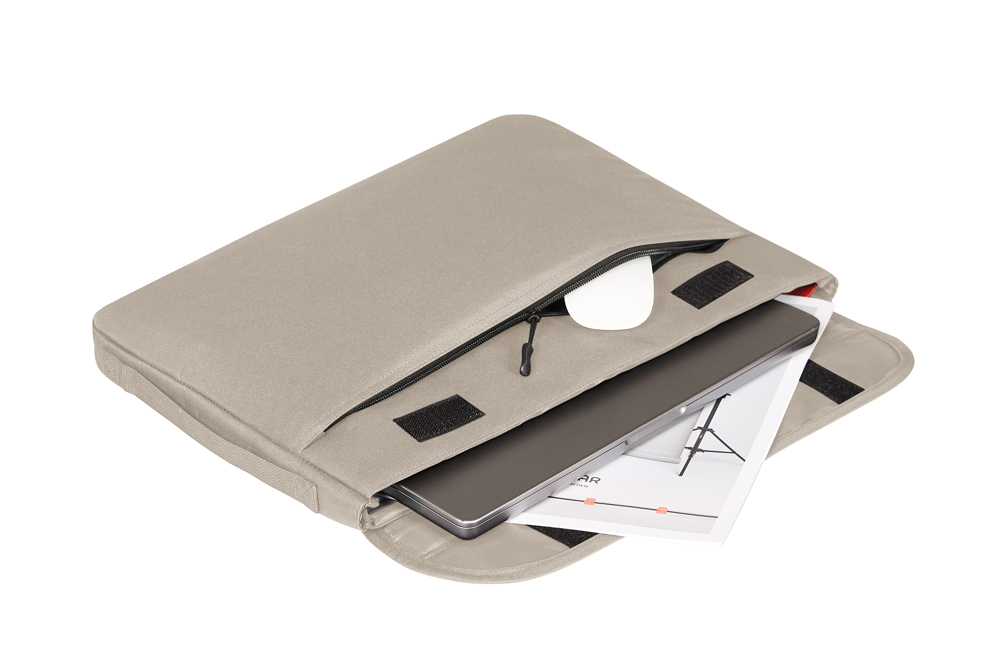 elegante laptophouder van gerecycled materiaal; gewatteerd hoofdvak; gewatteerde klep met klittenbandsluiting; groot voorvak met ritssluiting; intern vak voor AirTag; lussen aan de achterkant voor het bevestigen van accessoires, bijv. schouderriem (niet inbegrepen); ergonomisch achterhandvat, ook geschikt voor bevestiging aan een trolley-frame; plat zijhandvat voor eenvoudig optillen, bijv. uit rugzakken