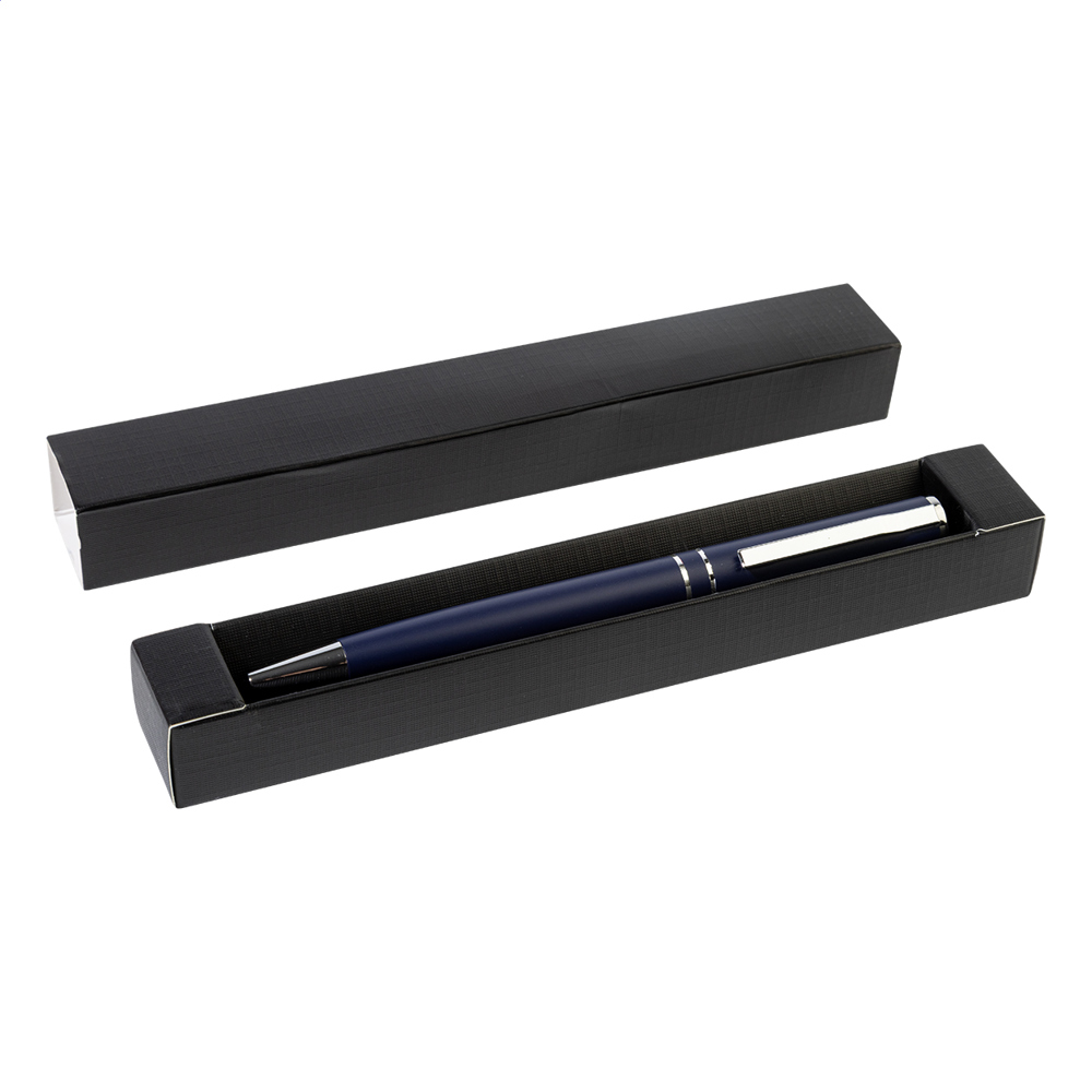 Stylo à bille à mécanisme rotatif en aluminium recyclé, avec attributs chromés. Présenté dans un coffret cadeau noir. Encre bleue.