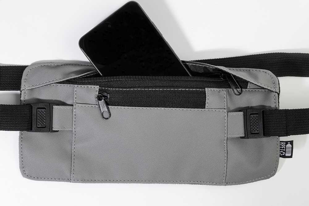 Sac banane fin en RPET, face frontale avec du PU, compartiment zippé, poche avant et bandoulière réglable. Polyester RPET 600D enduit de PU, labélisé RPET.