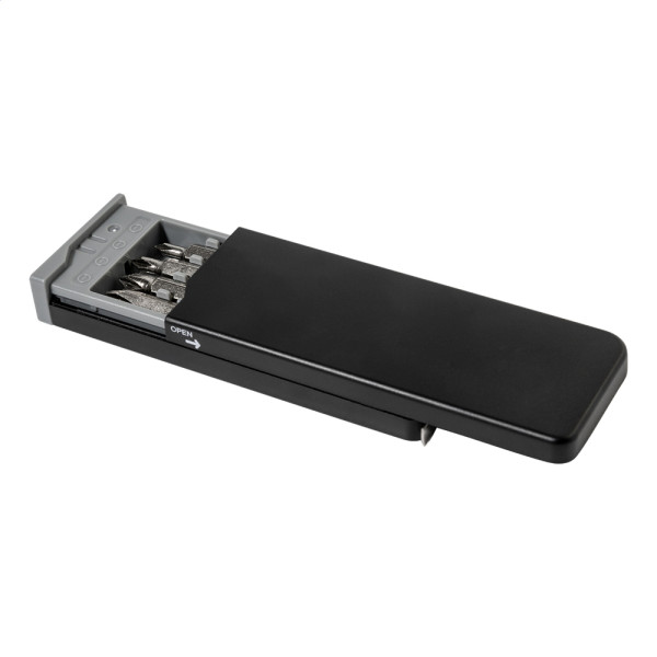 Coffret à outils compact en ABS recyclé avec 8 embouts de tournevis et un mètre ruban intégré de 1 m.