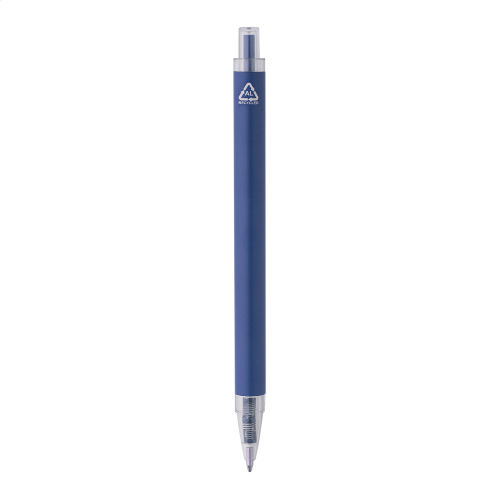 Stylo à bille en aluminium recyclé, corps à finition mate et attributs transparents en RPET. Encre bleue.