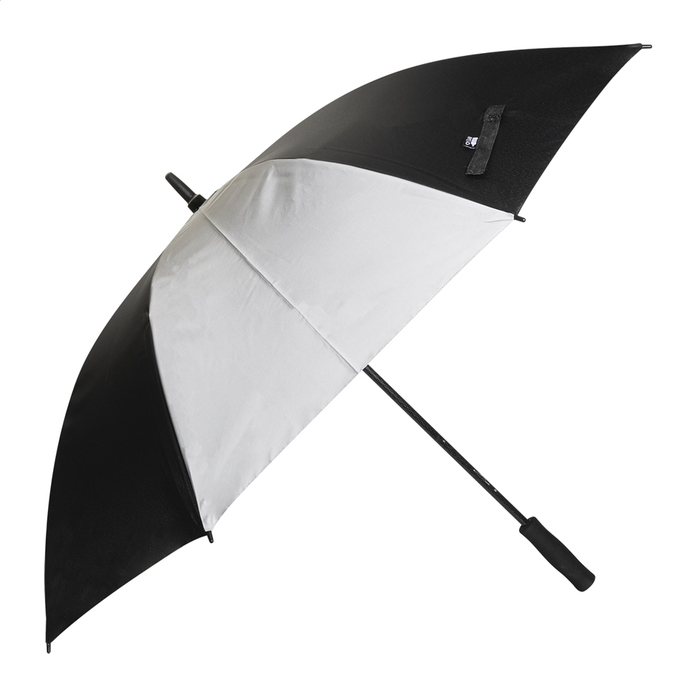 Grand parapluie manuel anti tempête, composé de 4 panneaux en pongé RPET 190T et de 4 panneaux en tissu réfléchissant. Armature et tige entièrement en fibre de verre, poignée en EVA. Labélisé RPET.