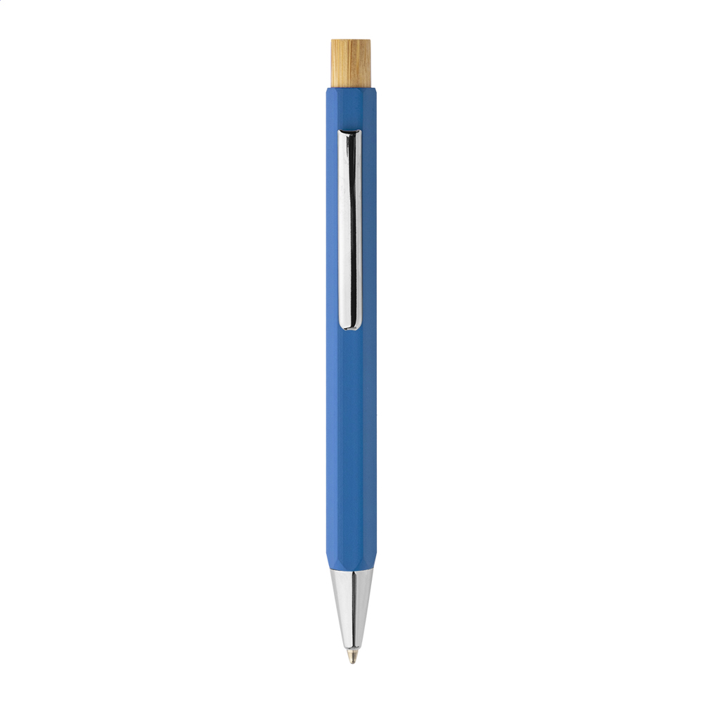 Stylo bille hexagonal en aluminium recyclé, avec bouton en bambou et pièces chromées. Encre bleue.