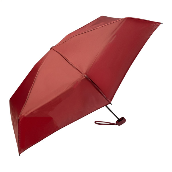Mini parapluie manuel 6 panneaux qui se replie en 3, pochette assortie et étui rigide zippé en EVA. Armature métallique, baleines en fibre de verre et poignée compacte avec dragonne. Pongé RPET 190T. Labélisé RPET.