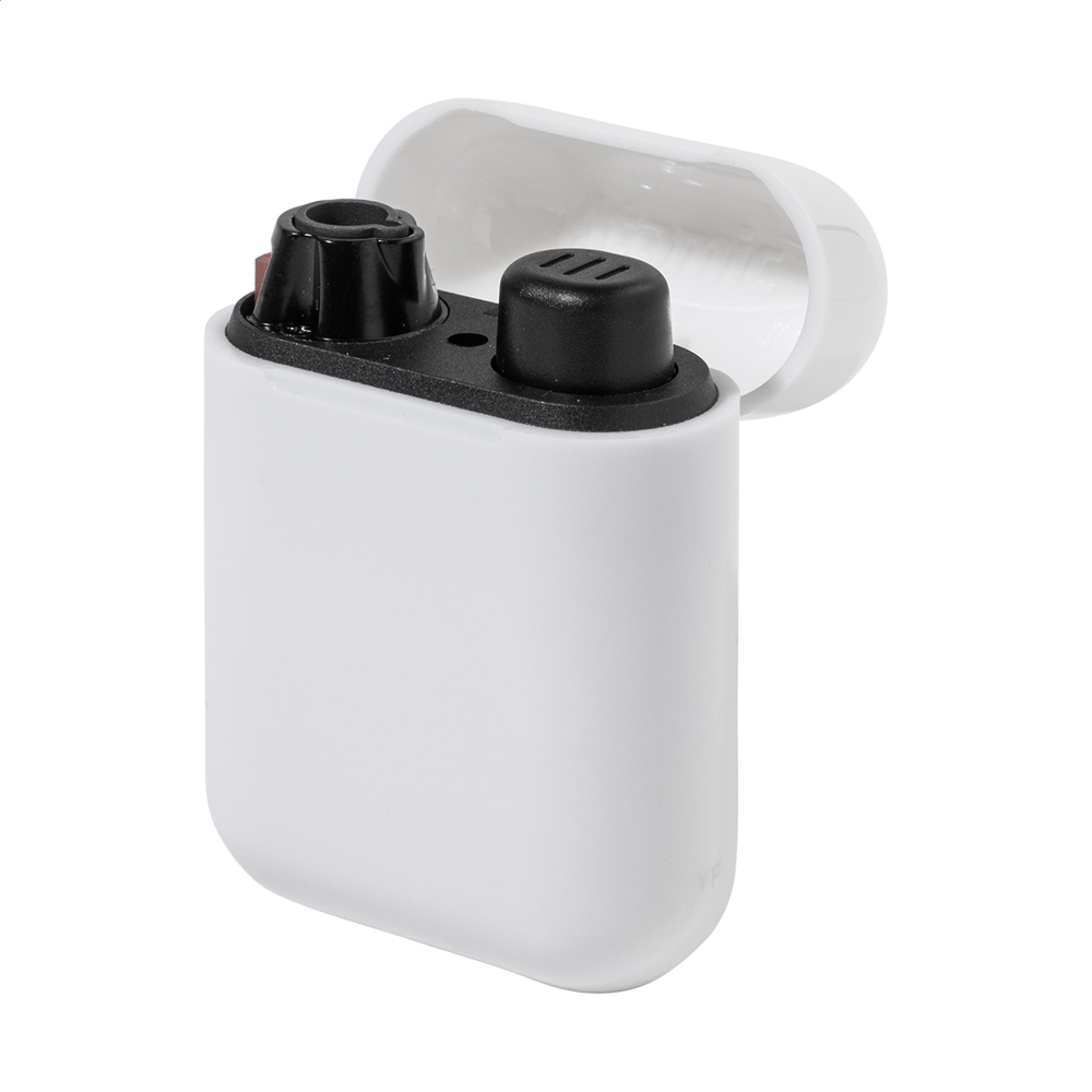 Briquet piézo-électrique rechargeable en plastique, présenté dans un boîtier tendance inspiré des écouteurs sans fil modernes. Sécurité enfant. Livré avec environ 80 % de gaz. Disponible uniquement par cartons d'exportation complets (multiples de 500 pièces) !